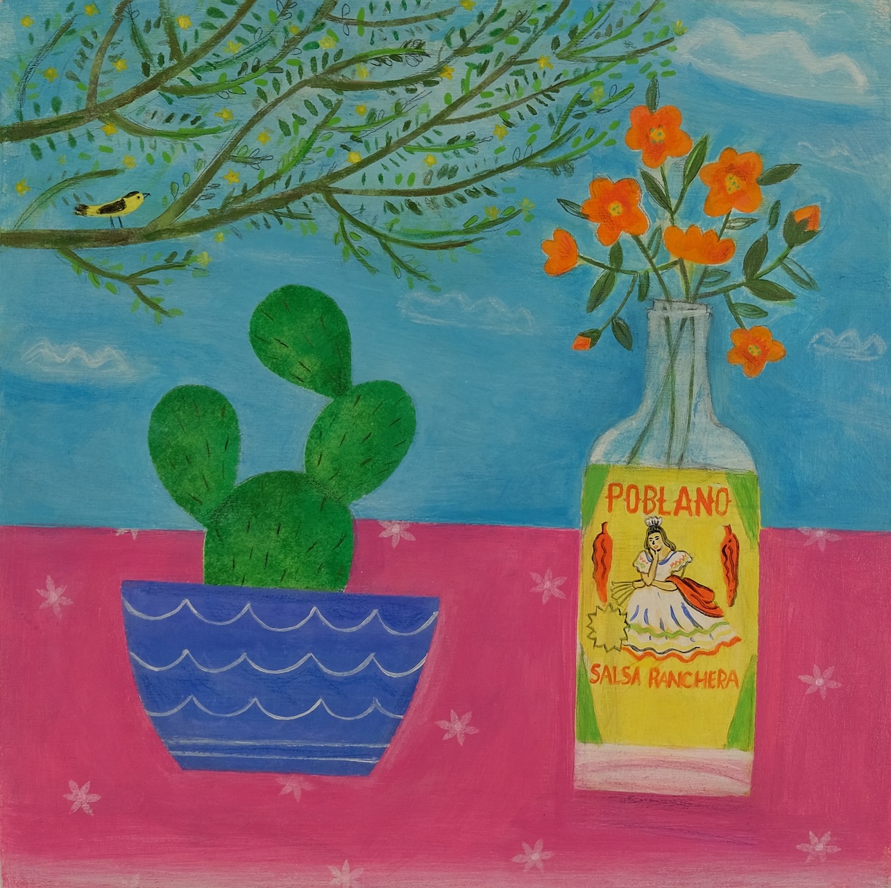 Cactus and Globemallow Flowers, acrylic and pencil on panel, 10 x 10 inches
