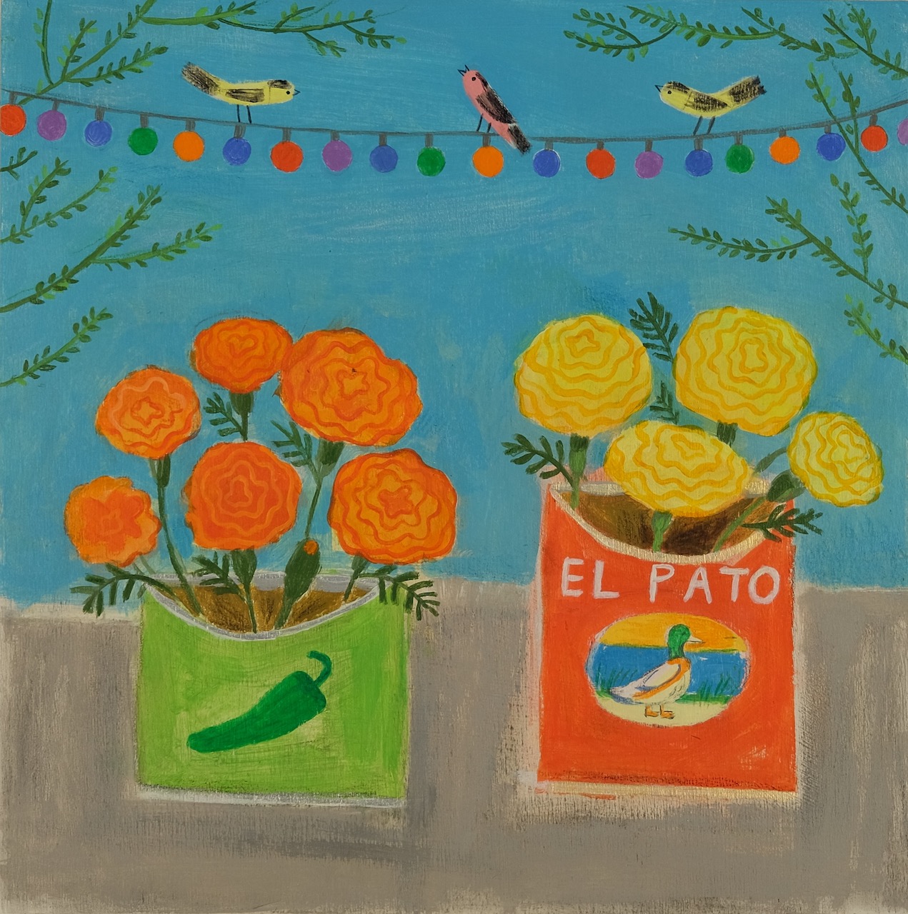 Ceci's Marigolds, acrylic and pencil on panel, 10 x 10 inches