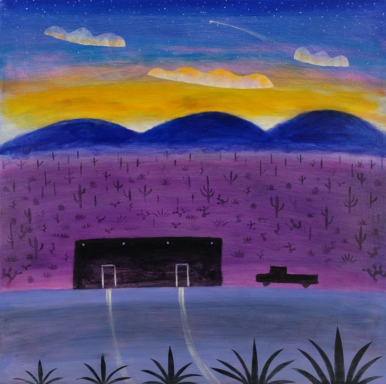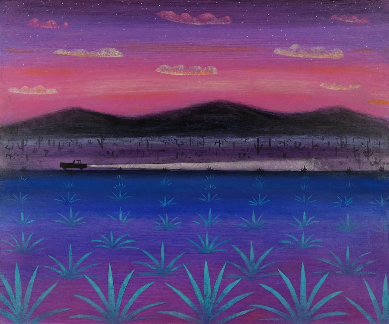 Night Drive, acrylic, pencil and phosphorescent paint on panel, 20 x 24 inches