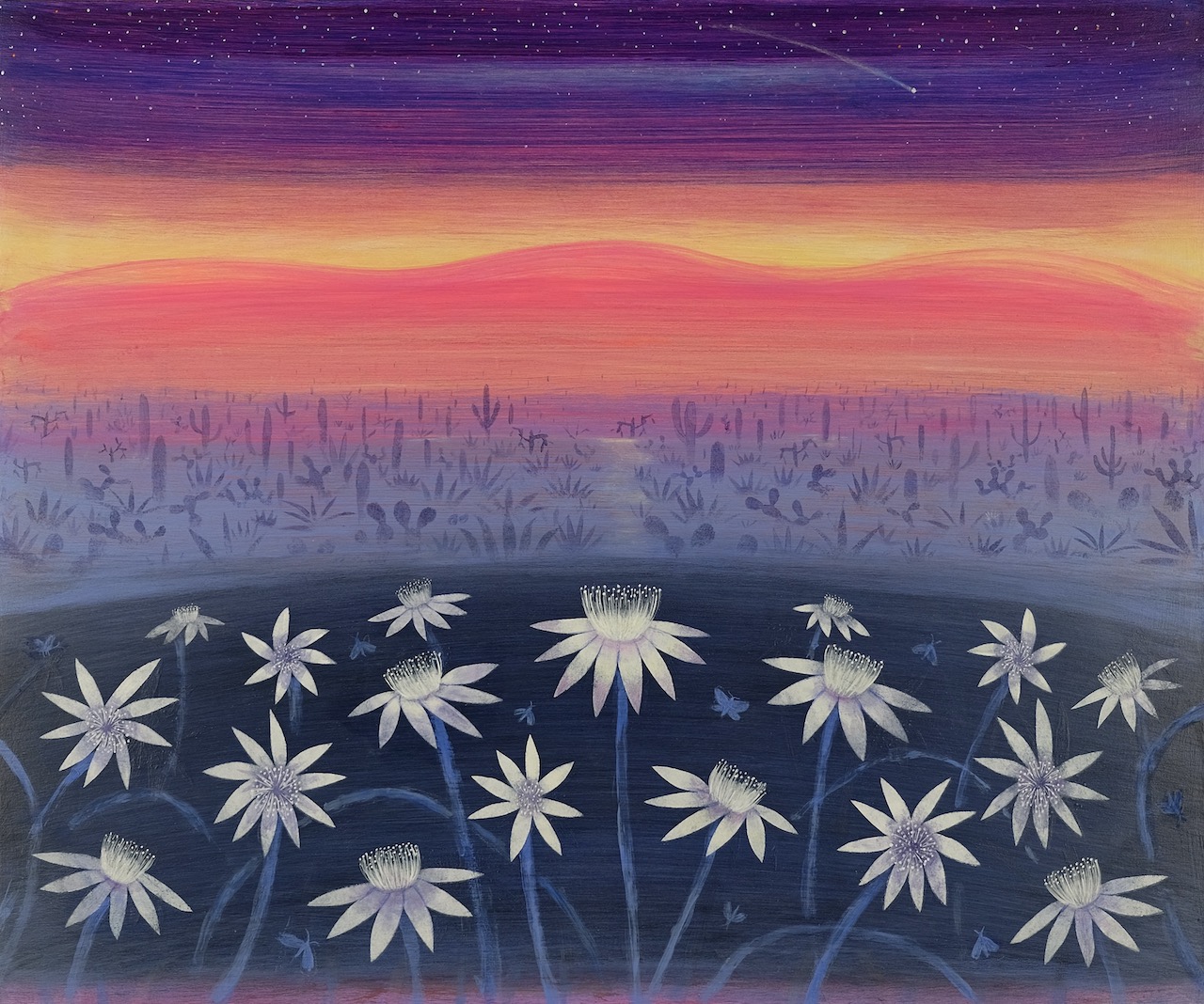 Night Blooms, acrylic, pencil and phosphorescent paint on panel, 20 x 24 inches