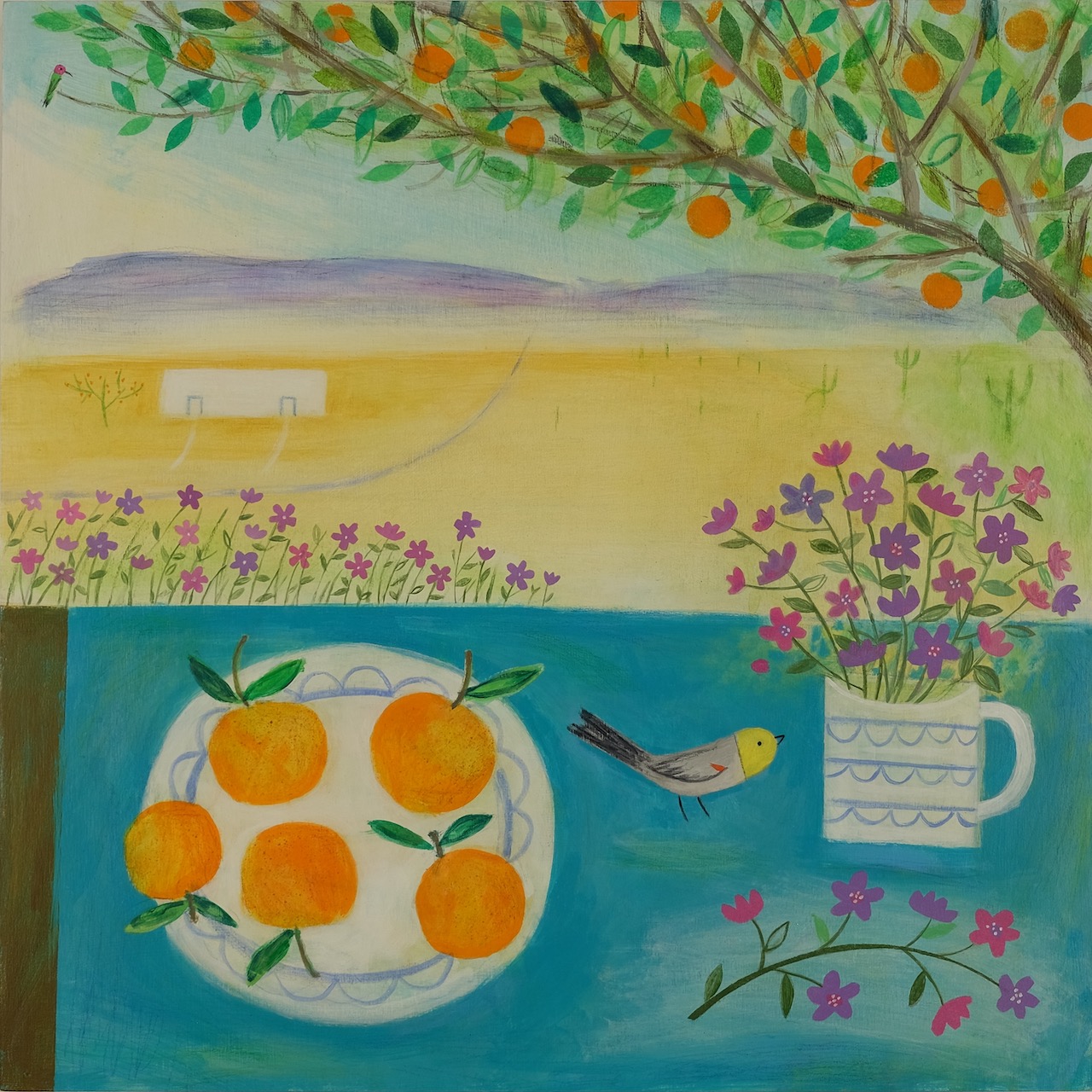 Oranges and Ruellia Flowers, acrylic and pencil on panel, 18 x 18 inches