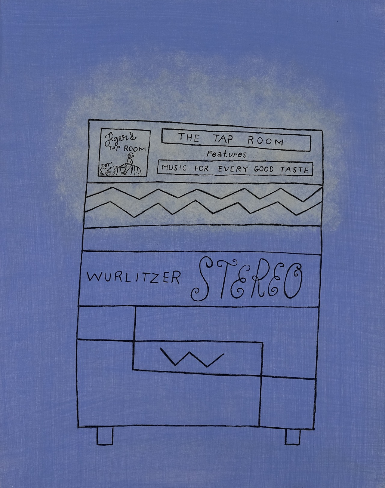 Tiger's Tap Room Jukebox (Wurlitzer 2710), acrylic, pencil and phosphorescent paint on panel, 11 x 14 inches
